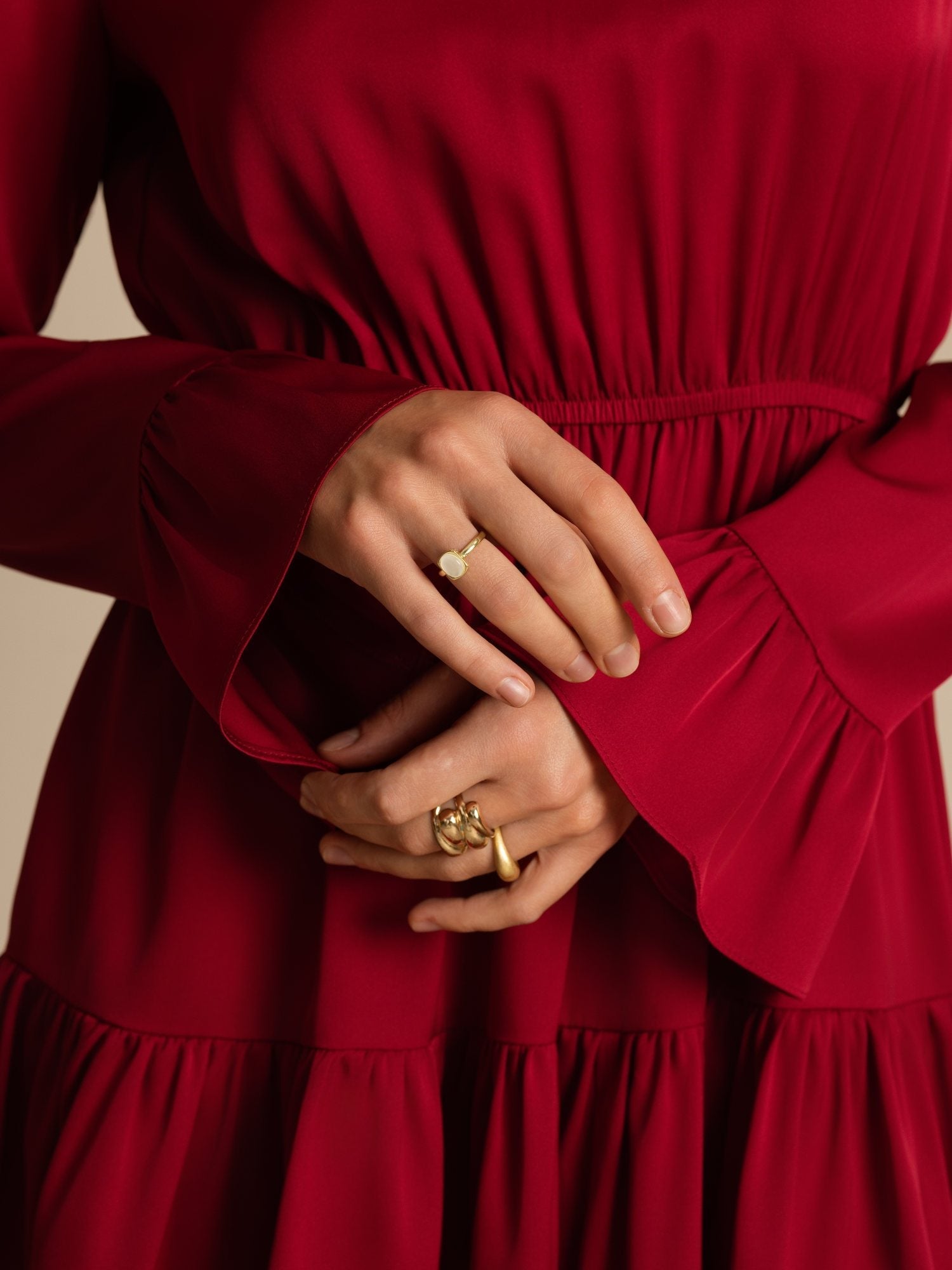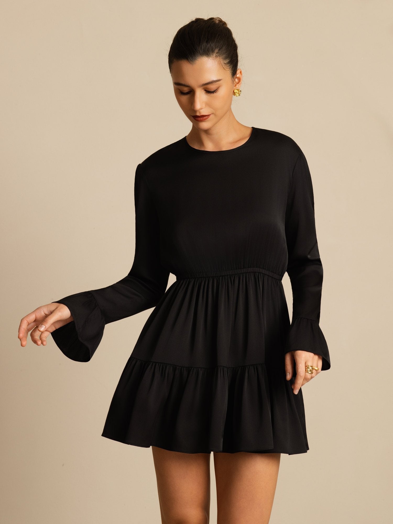 Valmistettu hienostuneesta 19Momme stretch-silkki double georgette -kankaasta, tämä mekko tuntuu sileältä ja kevyeltä ja siinä on pehmeä luonnollinen kiilto. Smockattu yläosa takaa mukavan ja imartelevan istuvuuden, kun taas röyhelöreunaiset pitkät hihat tuovat romanttisen ja naisellisen ilmeen. Regular-siluetti ja helppo päälle puettava malli tarjoavat sekä mukavuutta että eleganssia. Täydellinen iltamenoihin tai erityisiin tilaisuuksiin, tämä tyylikäs lyhyt mekko tuo vaivatonta hienostuneisuutta leikkisällä charmilla.