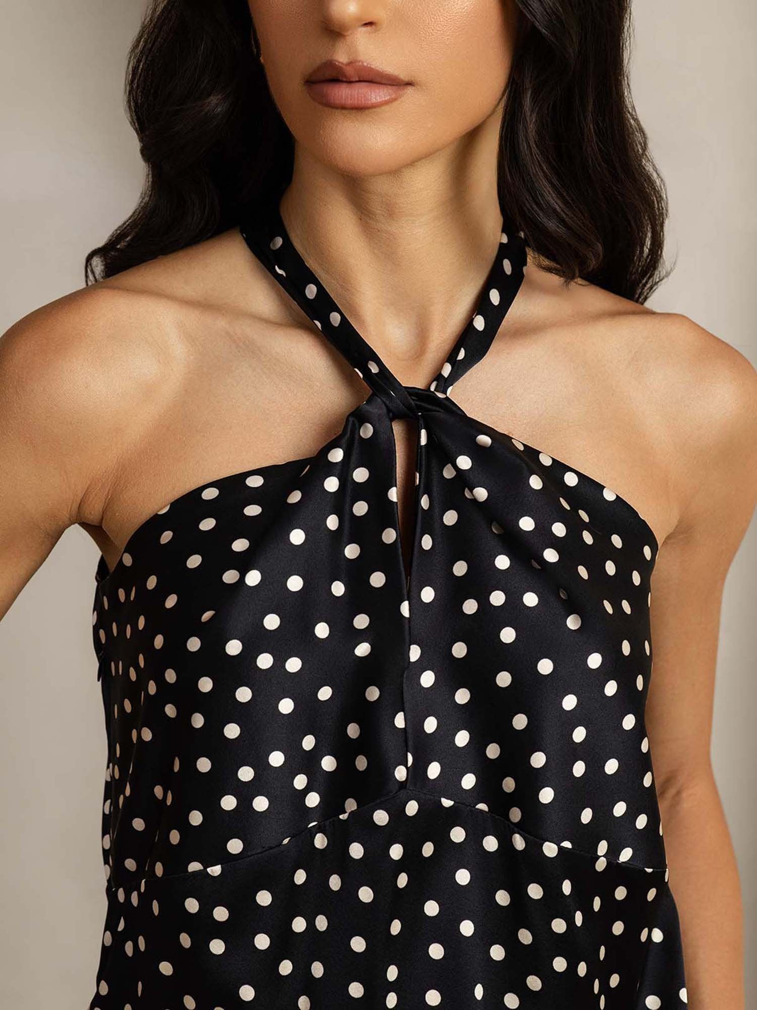 19Momme Silkkinen Hihaton Pilkkukuvio Halterneck Twist Top Selkäpuolen Napituskiinnityksellä