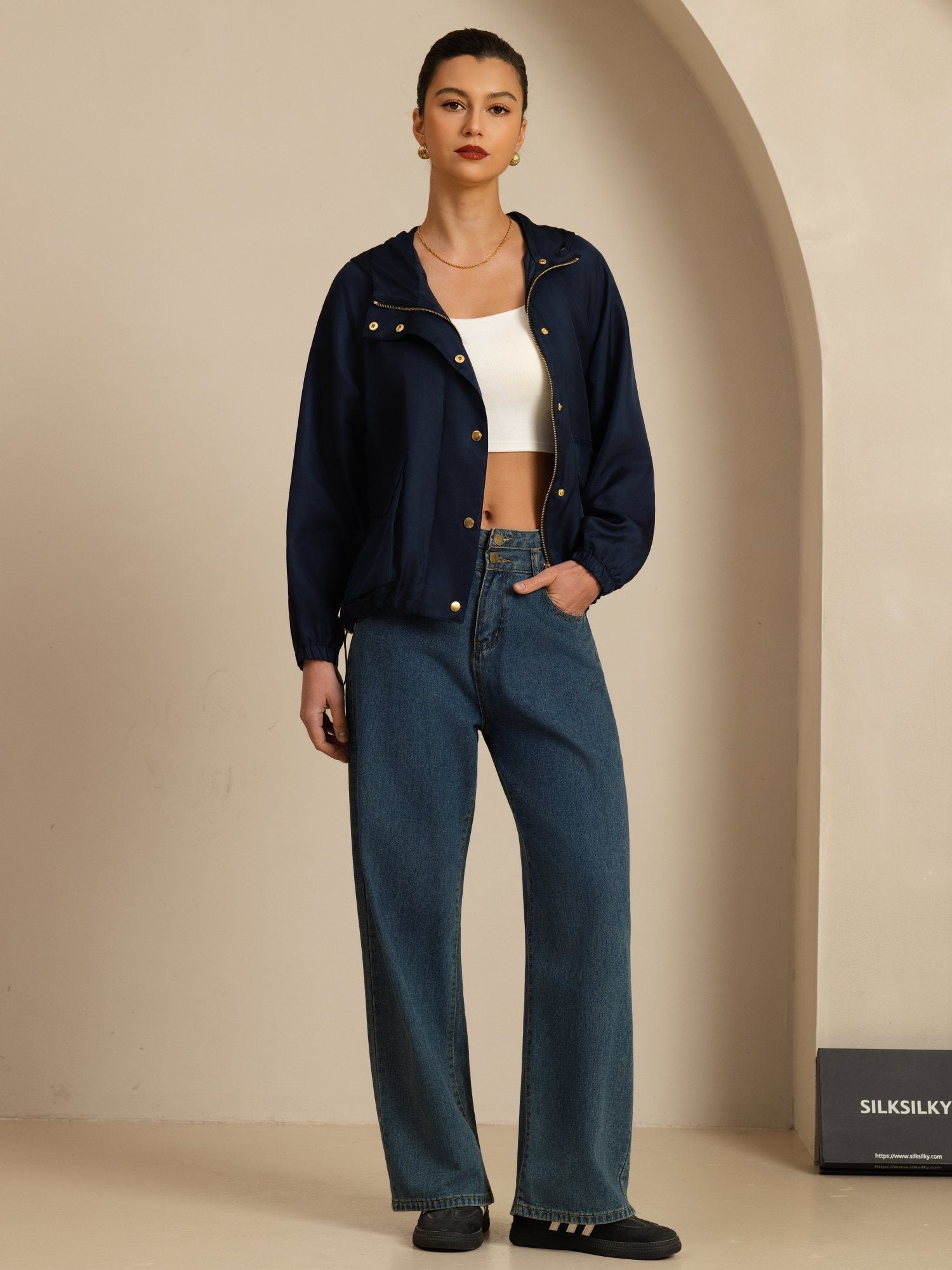 Valmistettu 18Momme silkkisatiinista surah, tämä takki tarjoaa silkkisen sileän kosketuksen ja hienovaraisen kiillon, yhdistäen kevyen mukavuuden ja hienostuneen tekstuurin. Lyhyt malli pidentää siluettia visuaalisesti, ja joustava vyötärö sekä nauhakuja mahdollistavat helpon säädön turvallisen ja imartelevan istuvuuden saamiseksi. Sopii päivittäiseen käyttöön keväällä ja syksyllä, ja sen yhdistäminen shortseihin, farkkuihin tai rentoihin housuihin on helppoa.