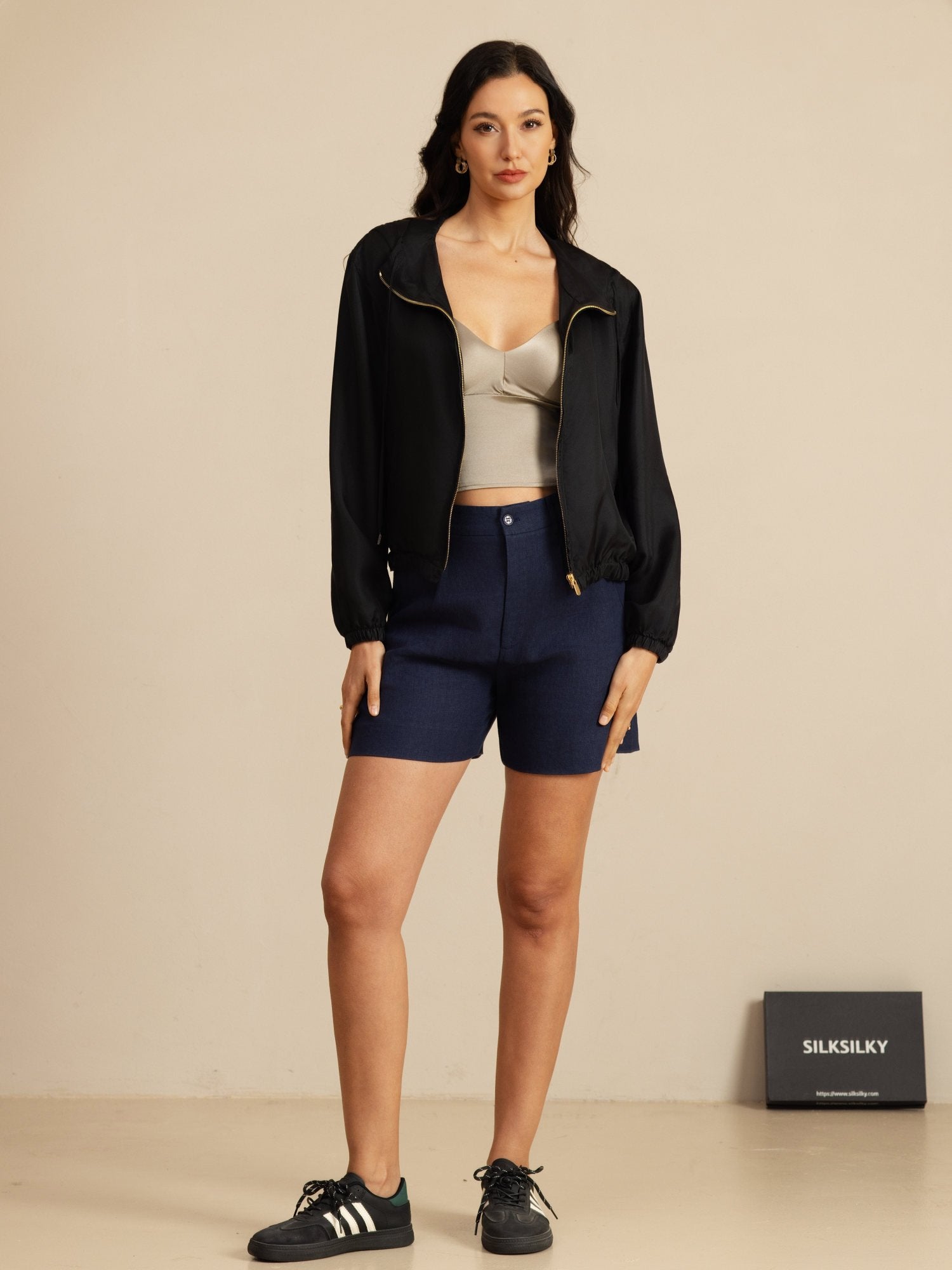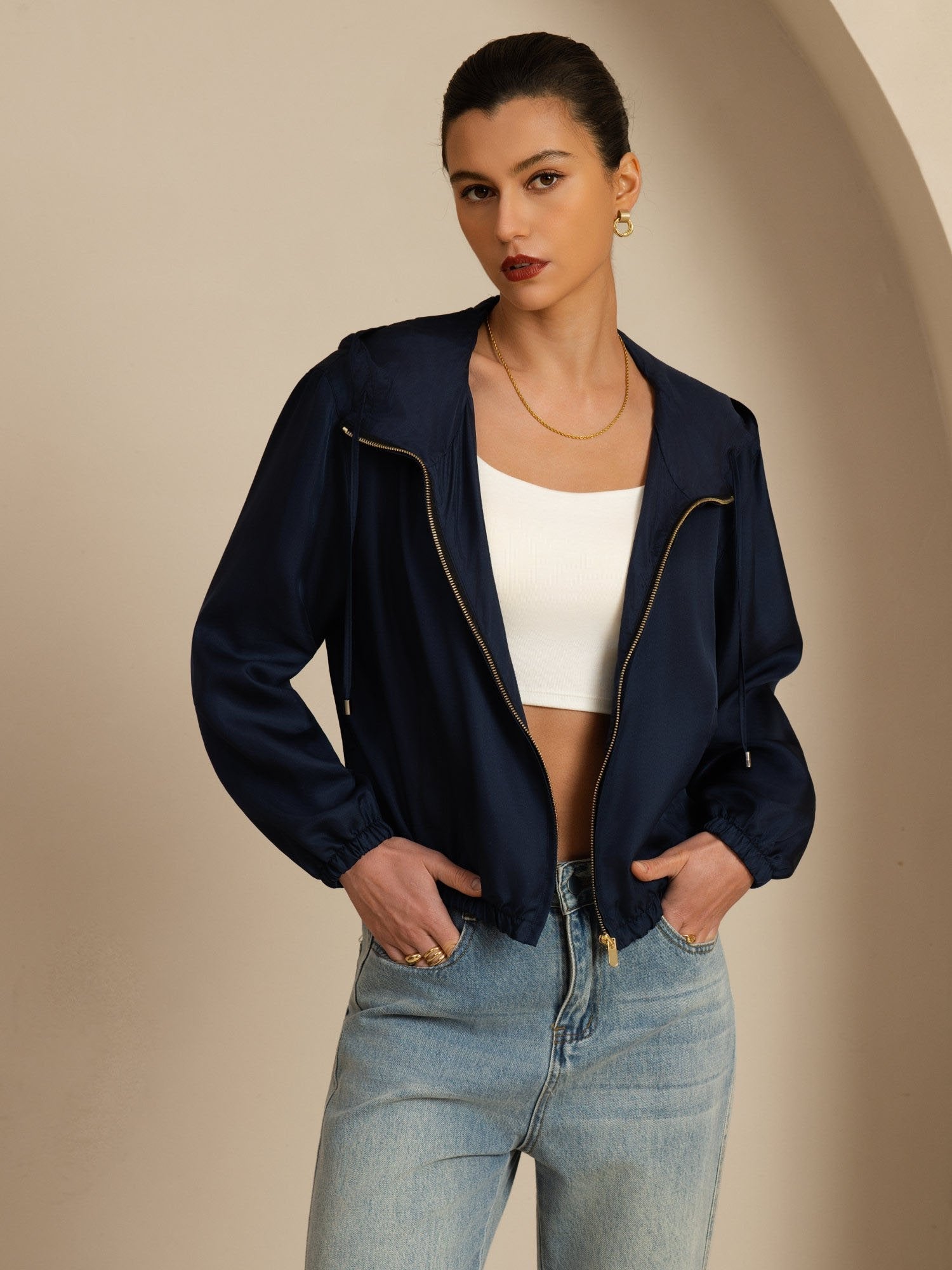 Valmistettu 18Momme silkkisatiinista surah, tämä takki tarjoaa sileän laskeutumisen hienovaraisella kiillolla ja hengittävää mukavuutta. Huppu säädettävällä nauhalla lisää käytännöllisyyttä ja rentoa urheilullista ilmettä, kun taas rakenteellinen pystykaulus korostaa puhdasta, modernia ilmettä. Sileä etuvetoketju mahdollistaa helpon kerrospukeutumisen, ja lyhyt cropped-malli nostaa visuaalisesti vyötärön linjaa. Viimeistelty toiminnallisilla taskuilla, tämä on hienostunut mutta monipuolinen vaate päivittäiseen käyttöön ja kevyisiin aktiviteetteihin.