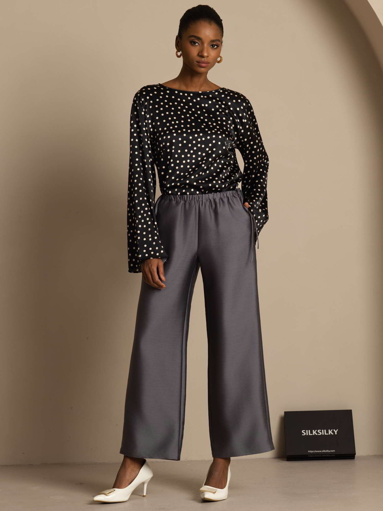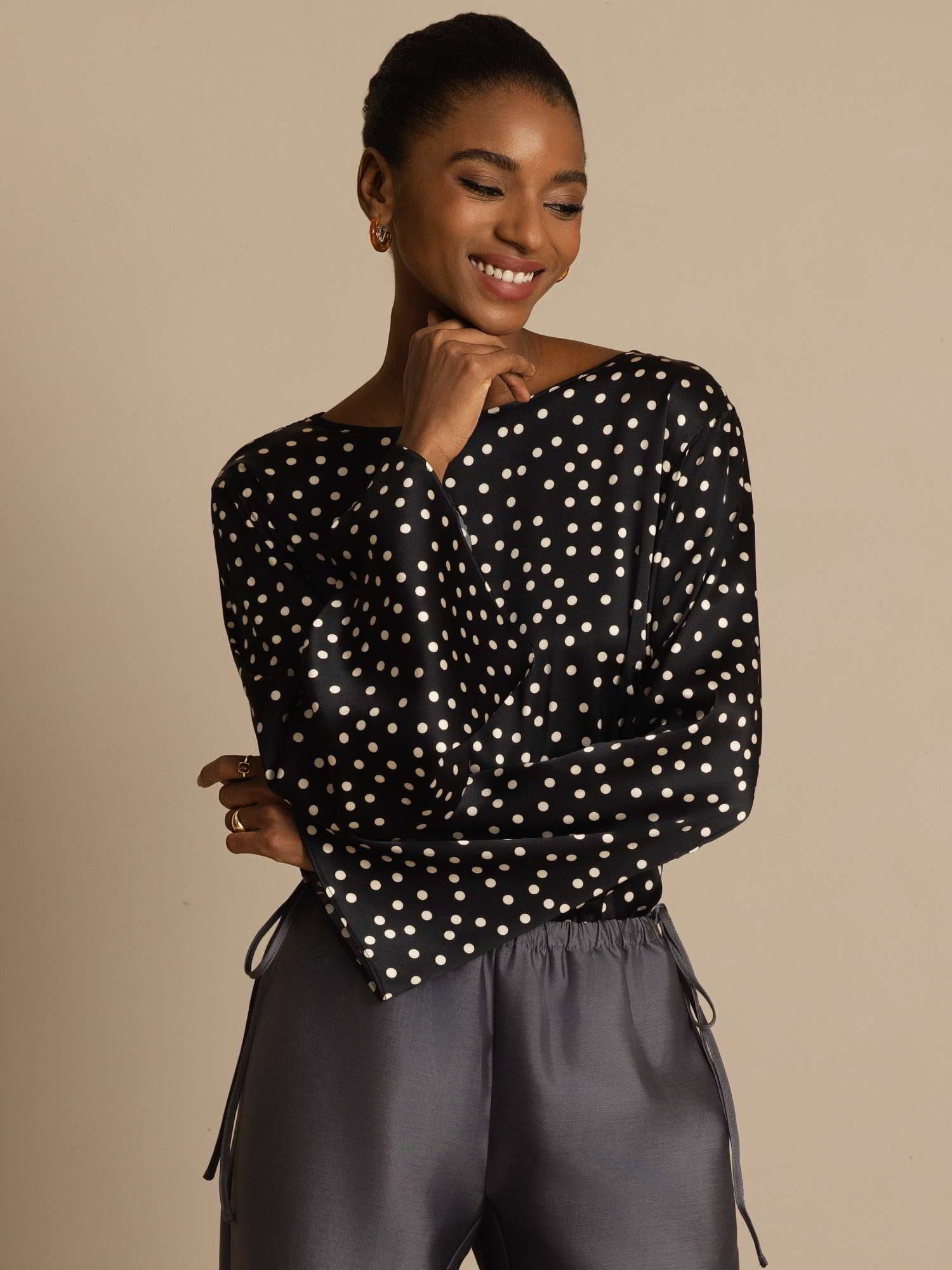 Was hesitant about the price, but the 19 momme weight makes a huge difference—it feels substantial. The boat neck sits perfectly without sliding around, showing just enough collarbone. The polka dot print adds such a fun, retro vibe to my wardrobe! Hand washing is a bit of a chore, honestly, but for this level of smoothness and that gorgeous drape, I’ll happily deal with the maintenance.